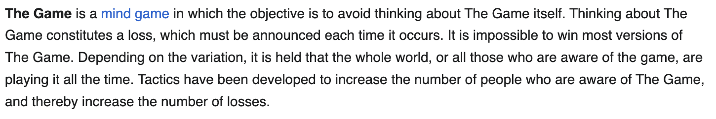 The Game is an Internet meme thing that .. oh it’s too dumb for words. Here’s the gist of it from the Wikipedia article: